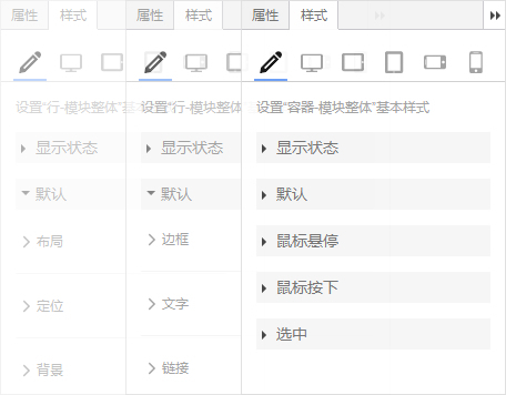 网页所有元素,均可设置五种屏幕(电脑宽屏、平板横屏、平板竖屏、手机横屏、手机竖屏)下的适配样式。
